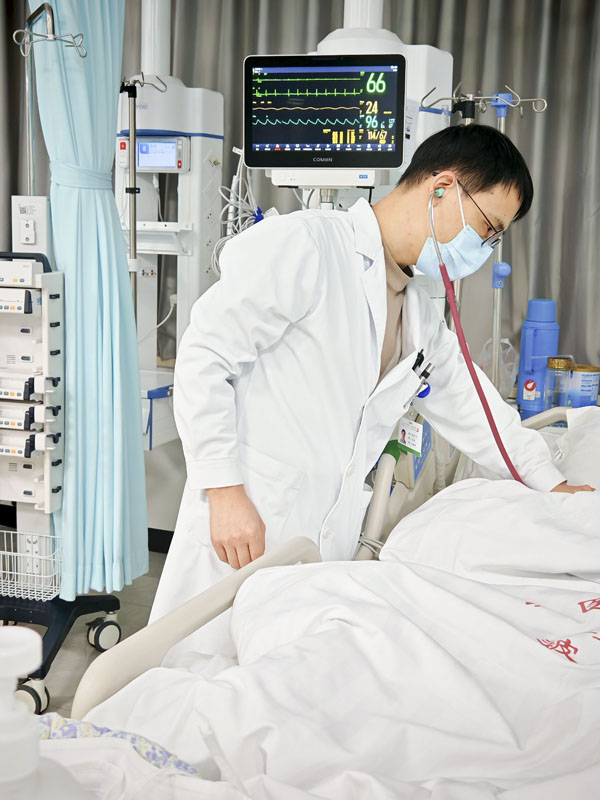 抢救室内,值班医师王耀贤、护理组长何宗泽早已准备就绪,气管插管、呼吸机辅助通气、高级生命支持……抢救措施紧张而有序,约40分钟后,患者恢复了自主心跳。